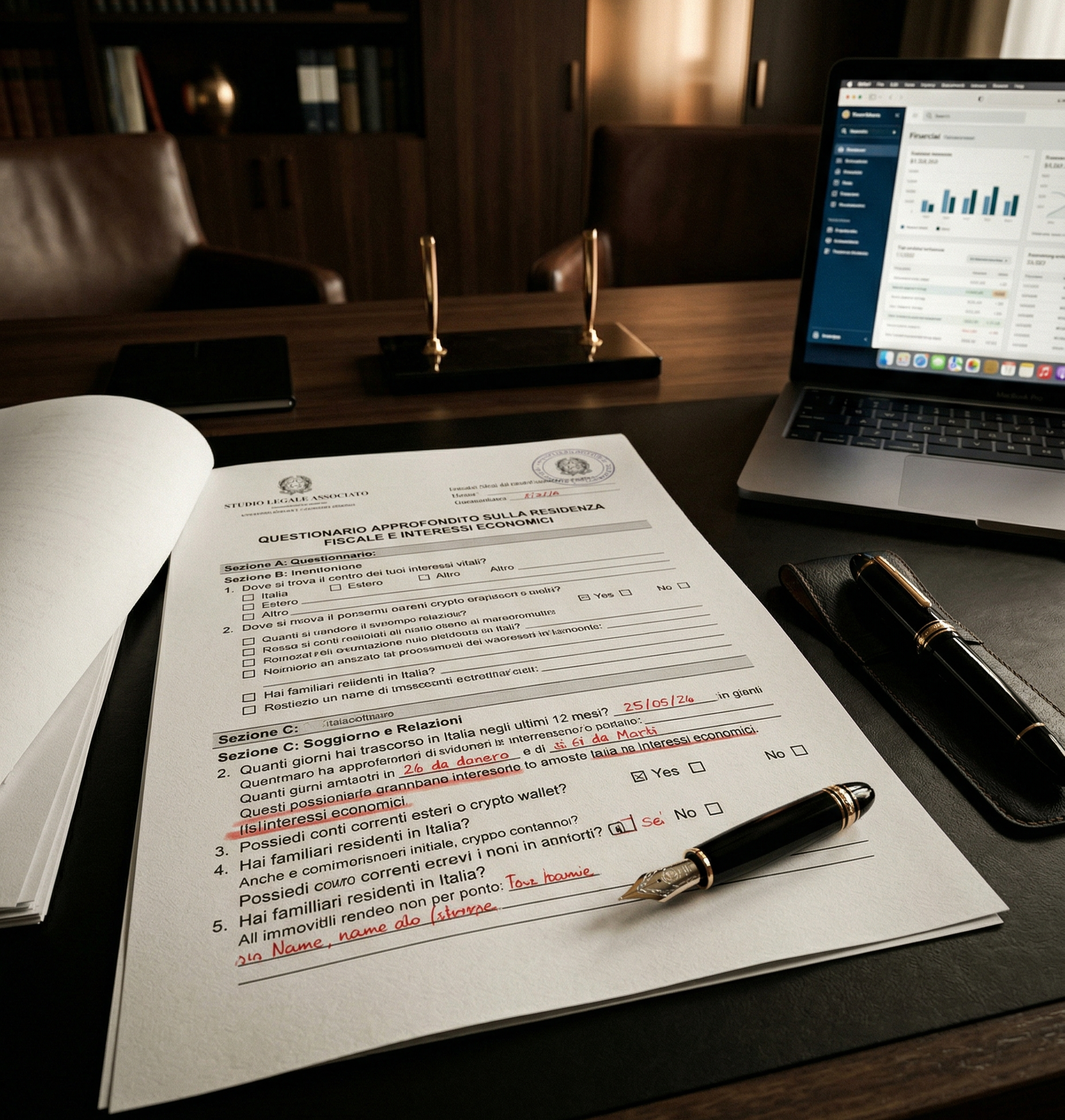 Un questionario approfondito che mappa ogni variabile che potrebbe diventare una vulnerabilità: la tua situazione personale, il modello di business, la struttura familiare, i tuoi asset, le crypto, i conti esteri, i legami residui in Italia, la tipologia di clienti, i piani futuri.